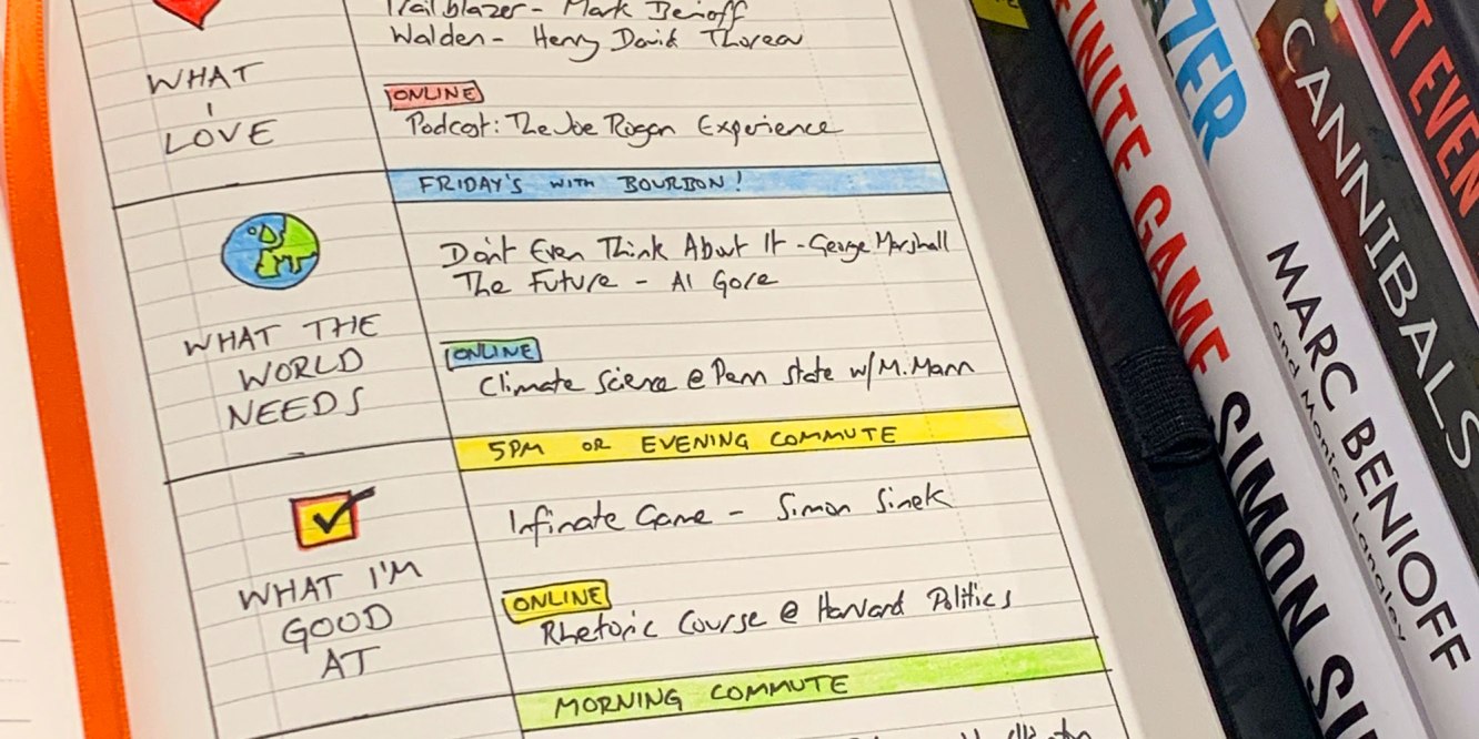 For example, some books I will read just for fun or to be inspired – they fall under “what I love” and are read late at night or on weekends. Some books I will read for work and they’re often a bit heavier, so I read those on my morning commute traveling to “what I get paid for”. Books that “the world needs” must be read with a good view, a nice drink (“An Old Fashioned please”) and no distractions, so that my brain has time to think and form a point of view. Lastly, something related to “what I’m good at” might be saved for my commute home to help me process the days work and give me something for tomorrow.