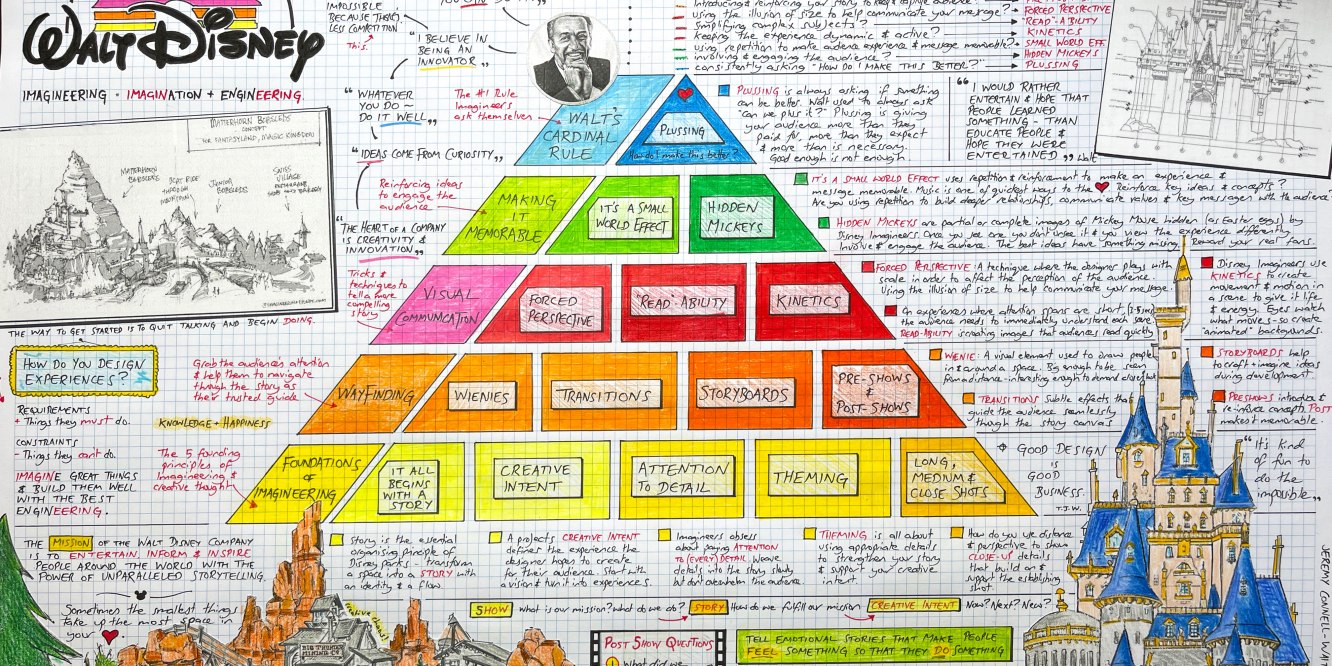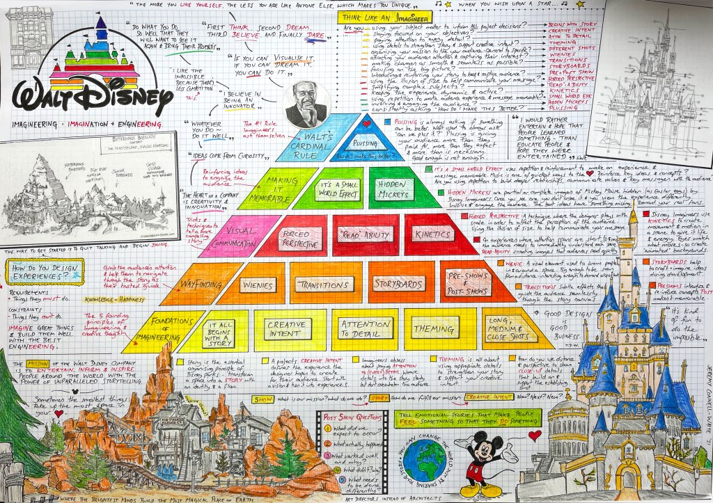 I have been studying “The Imagineering Toolbox” books recently by the brilliant Lou Prosperi. I discovered that behind the magical experiences that Imagineer’s create for their guests is a simple process for delivering “knowledge and happiness”. It’s called “The Imagineering Pyramid” and is a model that I think that could inspire us all to be better.