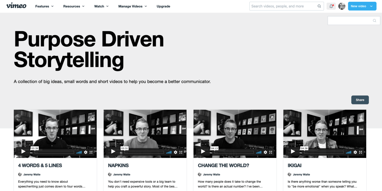 I have collated all my video shorts on purpose-driven storytelling and the art and science of communication into this handy playlist on vimeo. I hope you like them! Jeremy 🙂